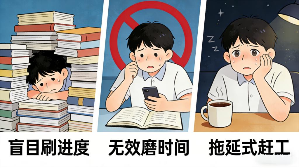 无效磨时间:久坐书桌却频繁分心,有效专注不足1小时,陷入自我感动。