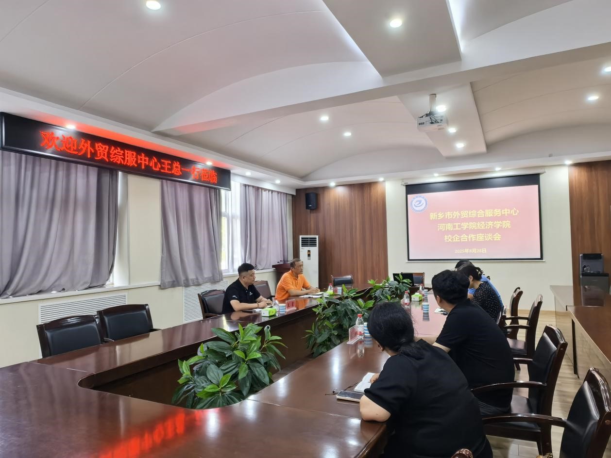 2025年8月29日下午,新乡市外贸综合服务中心总经理王震一行到访河南工学院经济学院,双方围绕深化校企合作、实现资源互补等议题展开深度交流座谈。经济学院院长魏芳、跨境电商教研室主任鲁锡杰及相关专业教师参加了此次座谈。