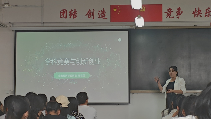 接着,杨雪莲老师以“学科竞赛与创新创业”为主题,与新生分享了历届商务经济学学子在全国多项赛事取得的优异成绩。她详细介绍了不同类型的学科竞赛,并展示了历届参赛者所获得的荣誉与成就。这些丰富多彩的赛项引起了2024级新生们的极大兴趣与关注,激发了同学们对专业学习的热情。