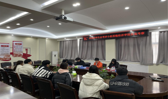 为了深入学习贯彻习近平新时代中国特色社会主义思想,持续提升各学院学生会改革实效,于1月2日下午,校学生会考评小组莅临经济学院,对我院2023年全年学生会工作进行实地走访考察。考评小组成员有校学生会主席团成员水浩琛、车辆学院学院学生会主席团成员冯晓天,电缆学院学生会主席团成员王泽秋,材料学院学生会主席团成员王壮豪。